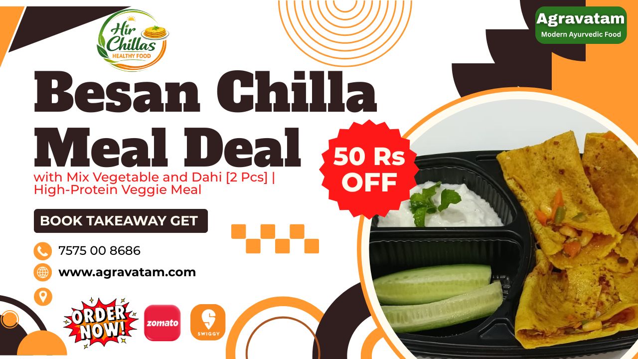 Yes, Besan Chilla is an excellent plant-based protein source. Made from gram flour (besan), it contains significant protein and complex carbohydrates. Hir Chilla by Agravatam enhances this by adding a variety of fresh vegetables and serving it with dahi (curd), creating a complete amino acid profile that helps in muscle maintenance and energy.